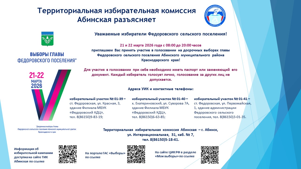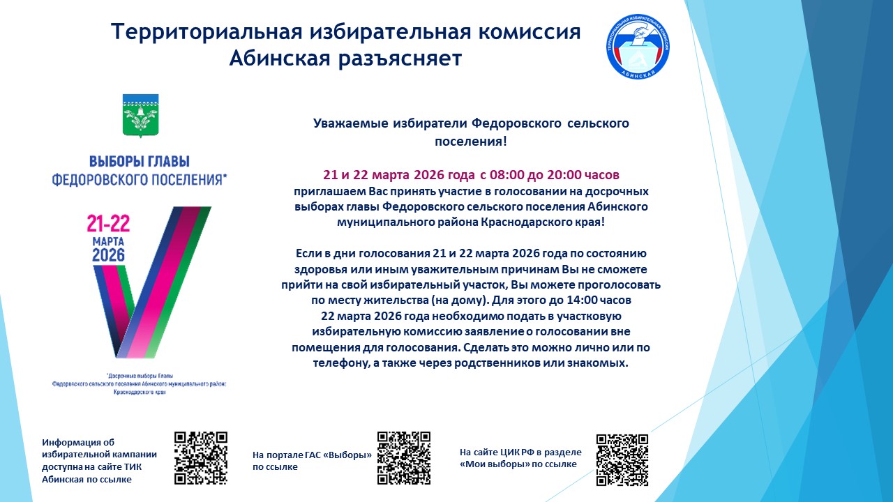 Приглашаем принять участие в досрочных выборах главы Федоровского сельского поселения Абинского муниципального района Краснодарского края! Ждем вас на избирательных участках 21 и 22 марта 2026 года с 08:00 до 20:00 часов!