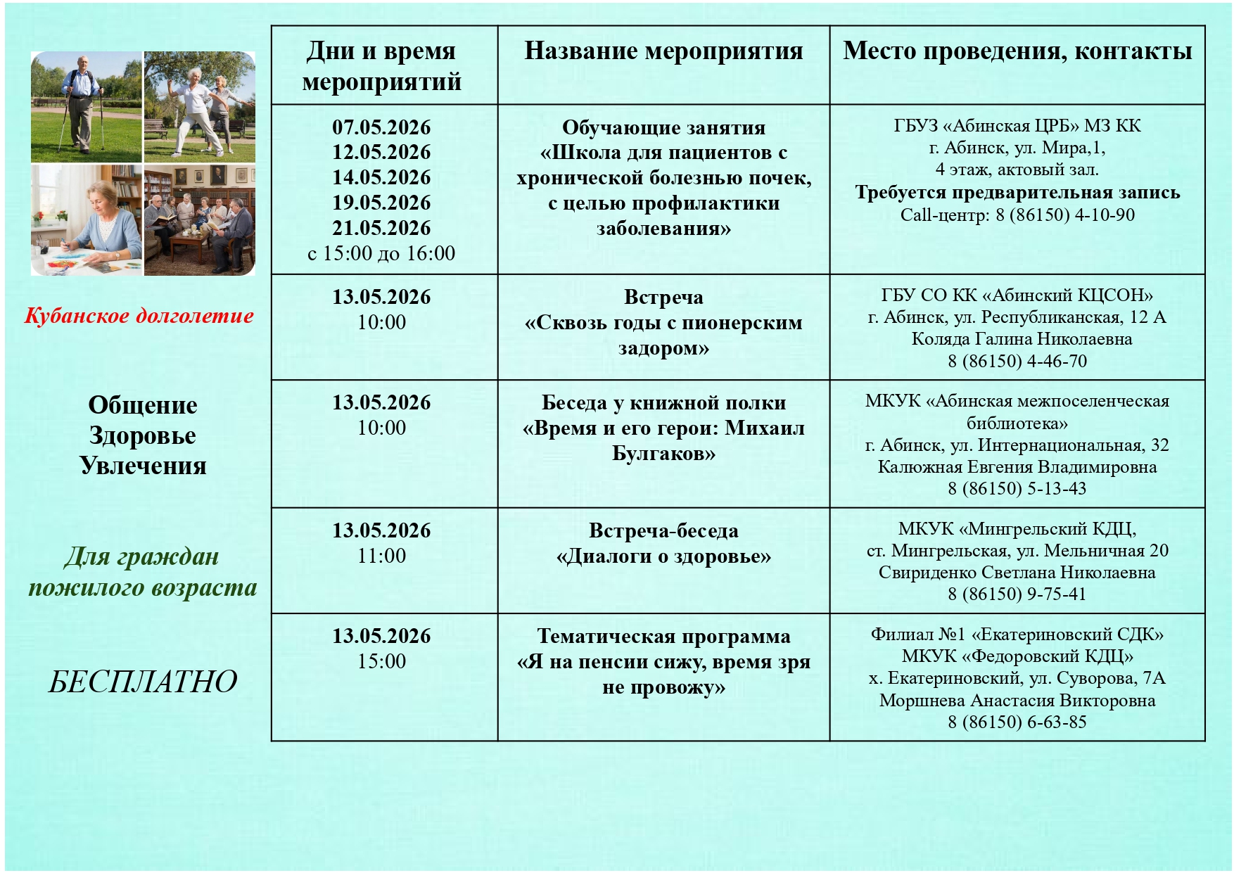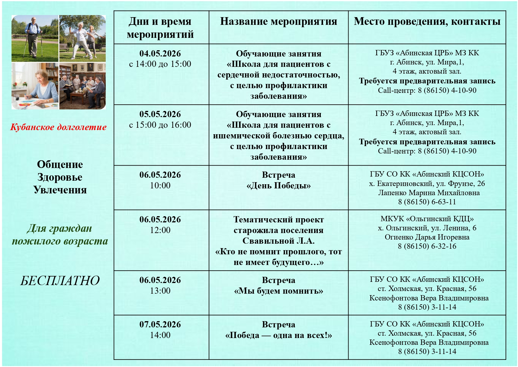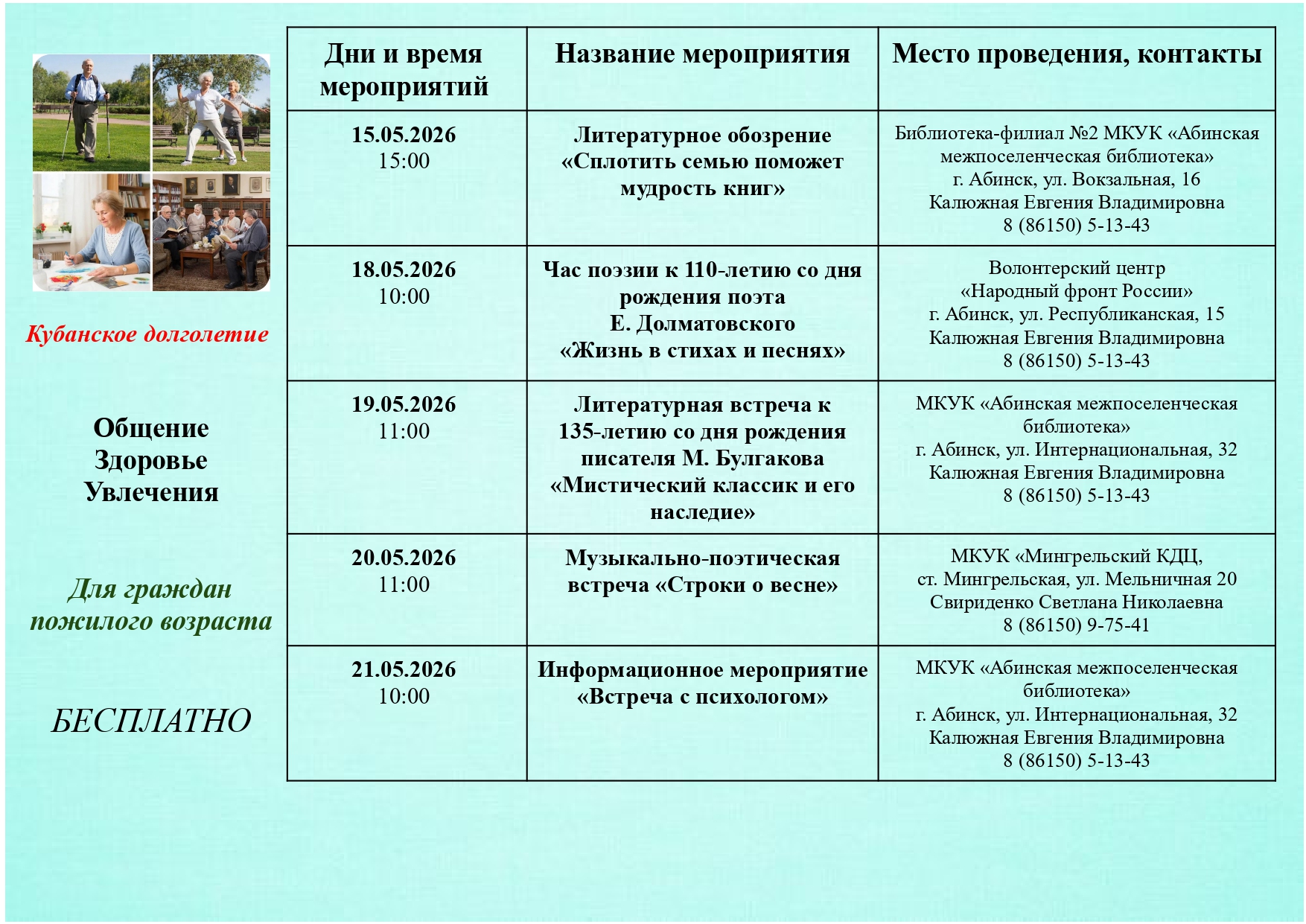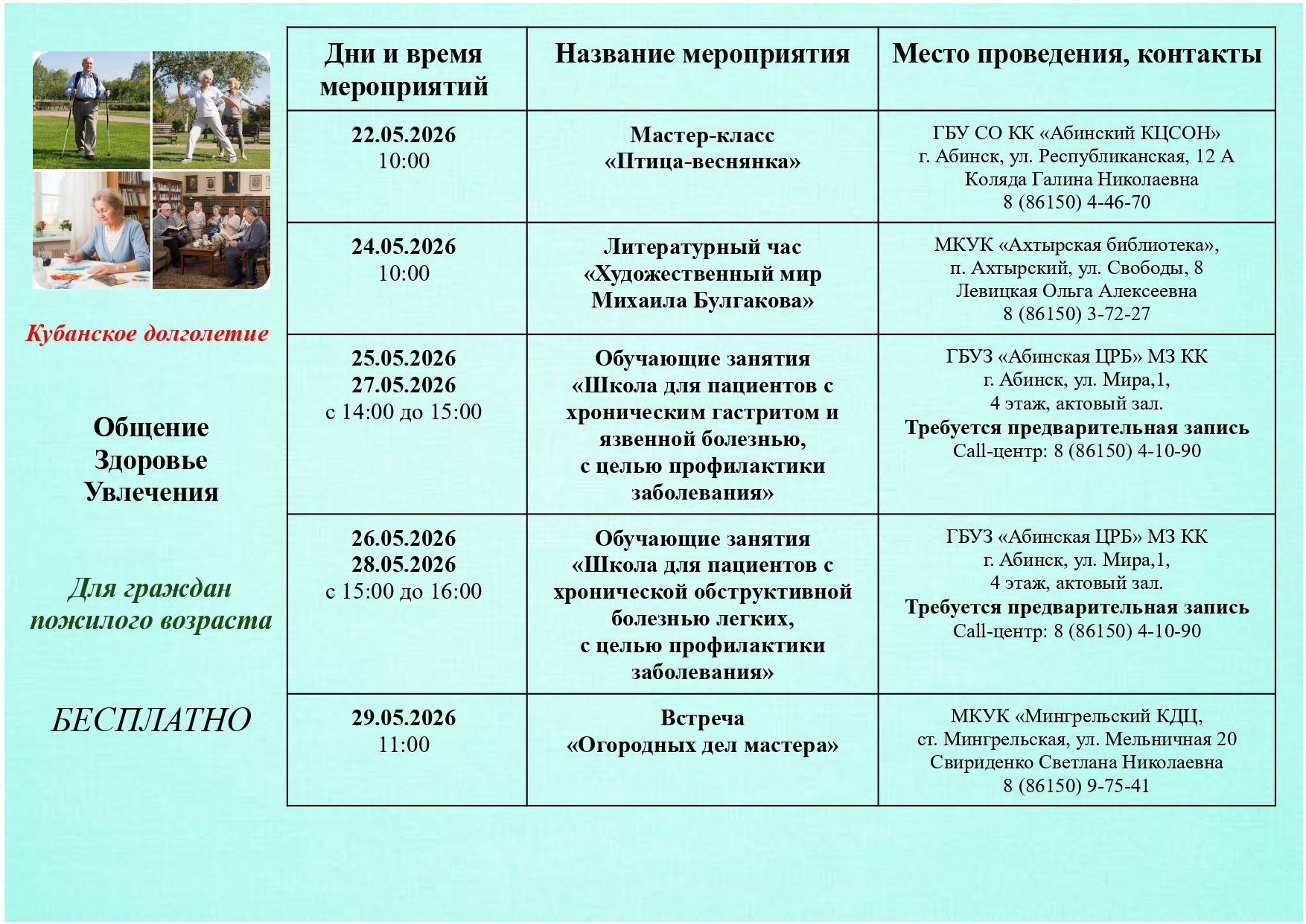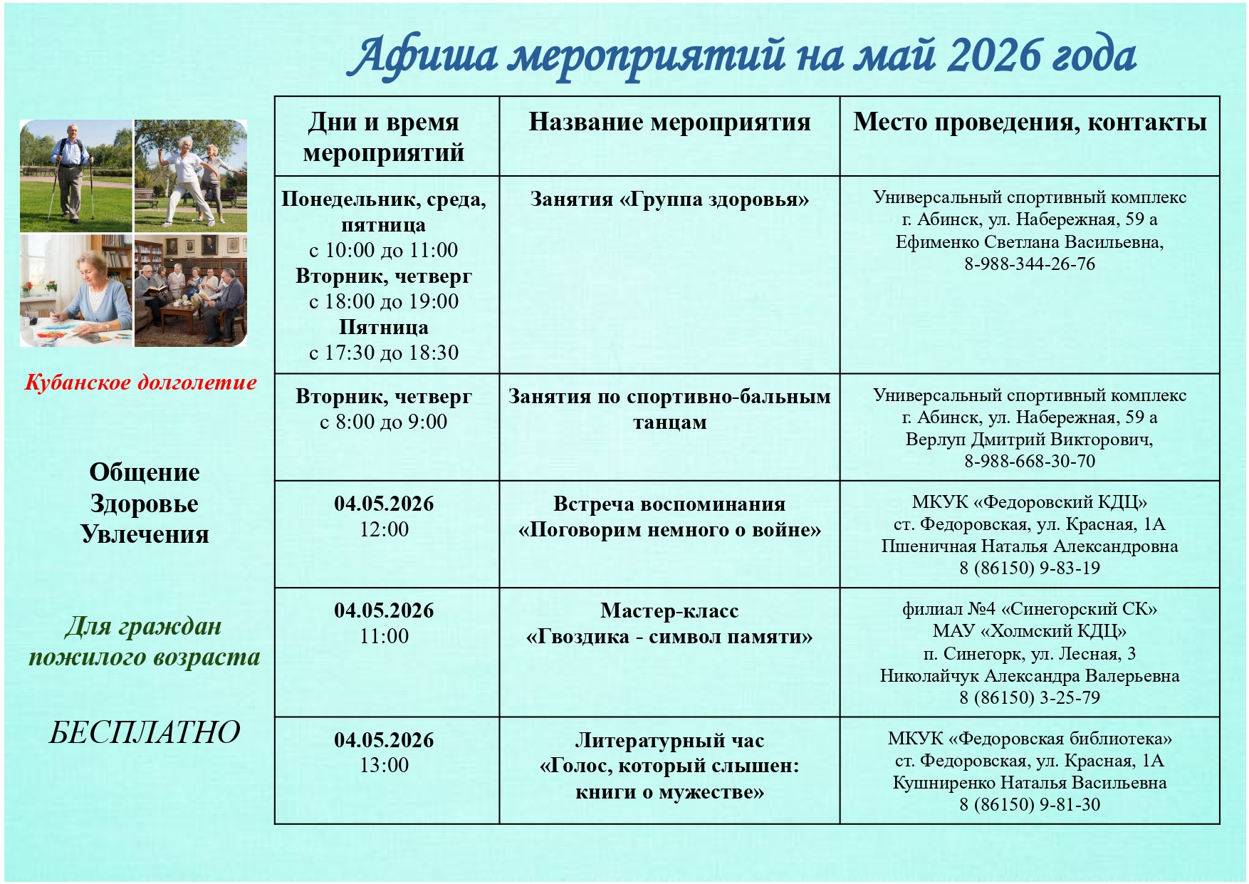 «Афиша мероприятий на май 2026 года в рамках реализации региональной программы «Кубанское долголетие»